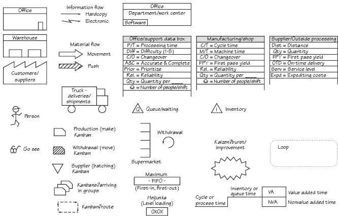 Dzięki informacjom zebranym podczas spaceru i dyskusji w zespole, nadszedł czas, aby naostrzyć ołówek i przelać ołówek na papier. Każdy VSM można narysować za pomocą prostych symboli lub ikon, z których niektóre pokazano na obrazku.