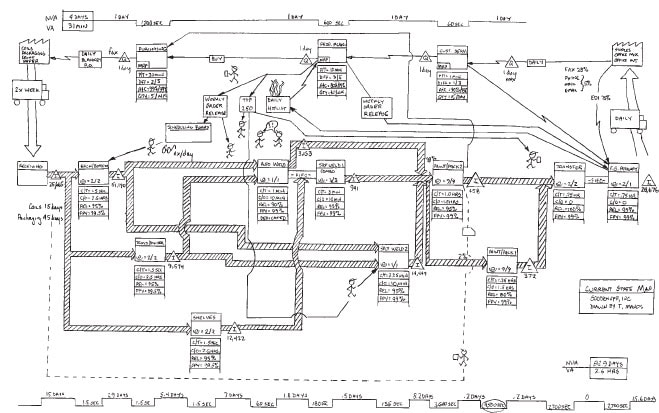 Jeśli jest to jeden z pierwszych kaizenów VSM, poproś doświadczonego moderatora o narysowanie mapy na dużej tablicy suchościeralnej, a członkowie zespołu narysują swoje własne mapy na papierze. Jeśli członkowie zespołu są bardziej doświadczeni, mogą najpierw zebrać dane, a następnie narysować mapę. Jeśli są ekspertami, mogą po prostu narysować mapę podczas zbierania danych. Mapa aktualnego stanu jest zwykle ukończona drugiego dnia, ale należy ją nieco dopracować następnego ranka. Pamiętaj, że podczas rysowania map gumka jest Twoim najlepszym przyjacielem.